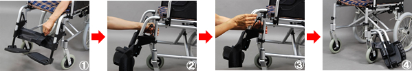 | 1.レッグサポートのマジックテープをはずします。 2.三角形のレバーを押します。 3.レバーを押したまま上に引き抜きます。 4.脚部の取り外しが出来ます 1~4だけの簡単操作で脚部が簡単に取り外しできるので、収納時はもちろん、トイレなどの移乗時により車椅子をご利用者様に近づけられるので、より安全に楽に移乗ができるようになります。 |