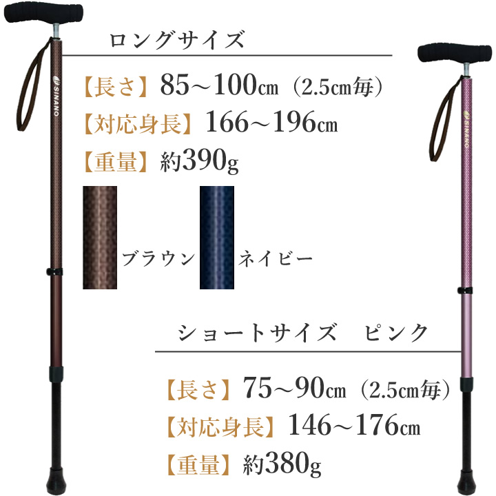 ロングサイズは、対応身長もおよそ166~196cmとなり、体格の良い方や、強い杖をお探しの方など、より多くの方にご使用いただけるようになりました。