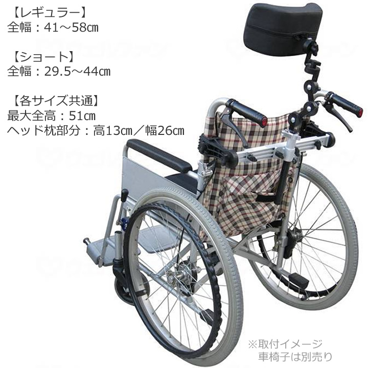 ○左右の背パイプの幅「外外」で、レギュラーサイズは36cm~50cm、ショートサイズは26.5cm~41cmの車いすに取付可能。