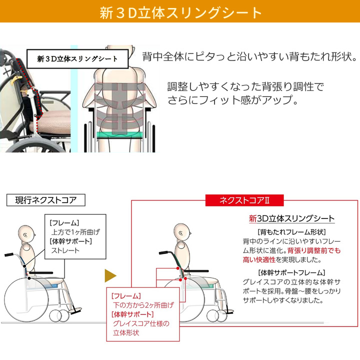「軽量」「コンパクト」はネクストコアを継承、体幹サポートフレームはグレイスコアの立体的な体幹サポートを採用。