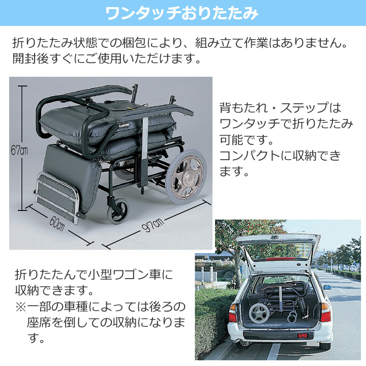 | 詳細 | 折りたたみサイズ:幅60×長97×高67cm 座面サイズ:幅45×奥行47cm 前座高:49cm 背シート高:77cm 肘掛け高:16ccm 前輪:6インチキャスター 後輪:14インチチューブタイヤ |